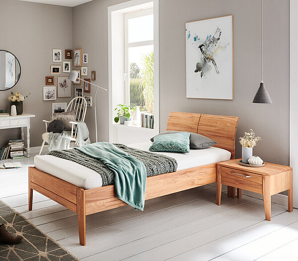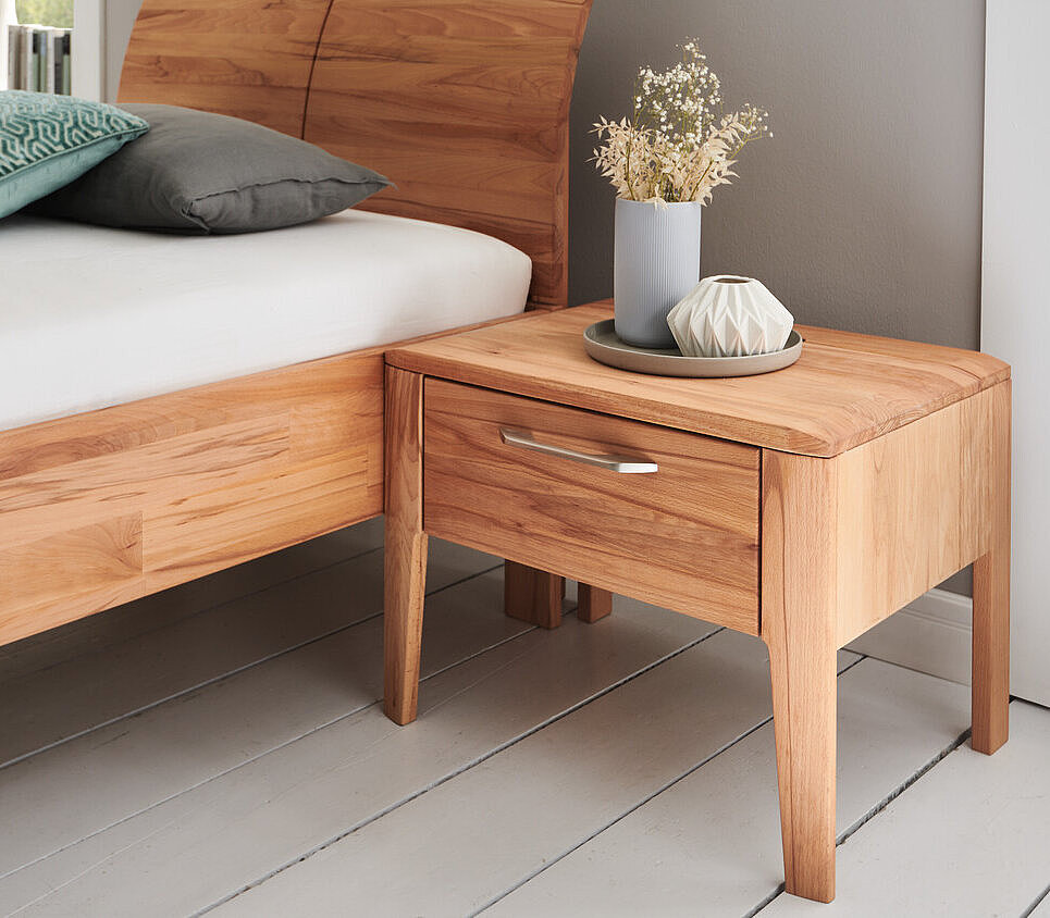 Das Massivholzbett InCasa Marino beeindruckt durch handwerkliche Details und die elegante, harmonische Linienführung. So kommen die lebendigen Hölzer Wildeiche und Kernbuche besonders gut zur Geltung. Das Kopfteil ist entweder als leichte Rundung ausgeführt oder mit gefrästen Wellen, die sich auch beleuchten lassen.